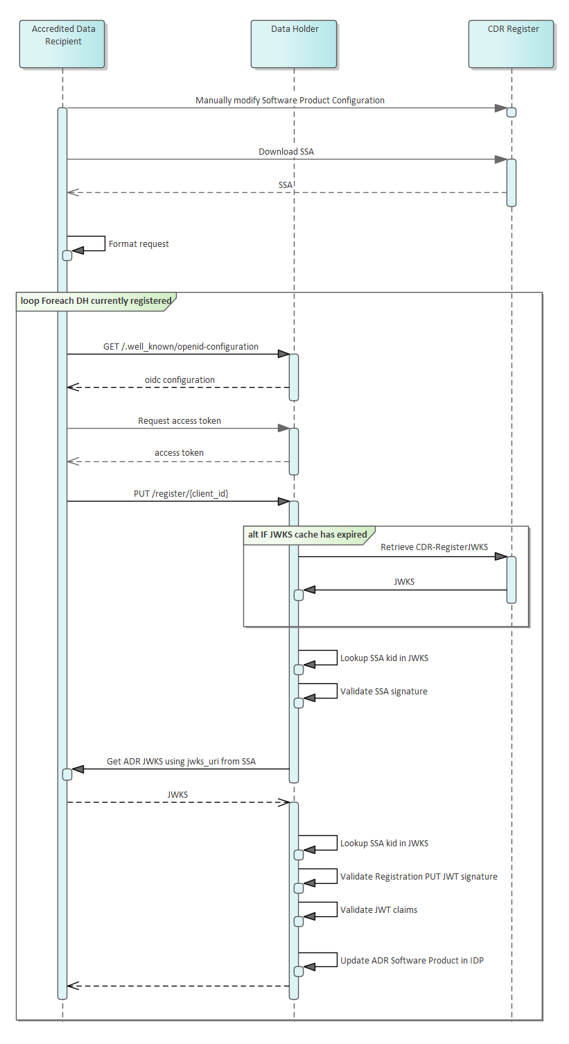 | 30/10/2019 | 0.8.0 | Updated Client Registration | Reverted back Registration flows sequence diagrams to no longer include status checks for the software_id, instead relying on the CDR Register controlsAdded non-normative examples for maintenance flows and error scenariosSSAs will only be issued for active software productsAdded Registration Validation section |